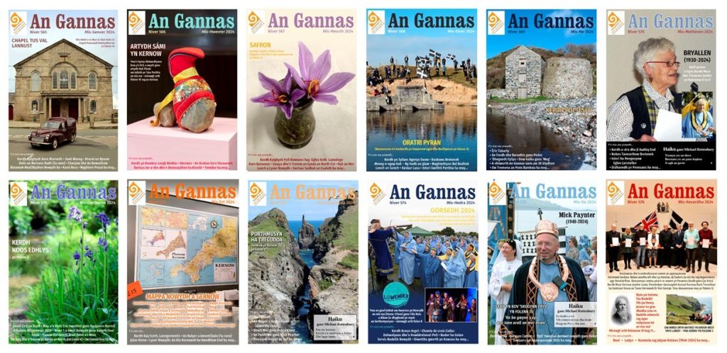 An Gannas is a magazine written entirely in Cornish which is published every month by the Kowethas and sent to its members. Many members contribute articles on various subjects every month so there is ‘something for everyone’ in it.