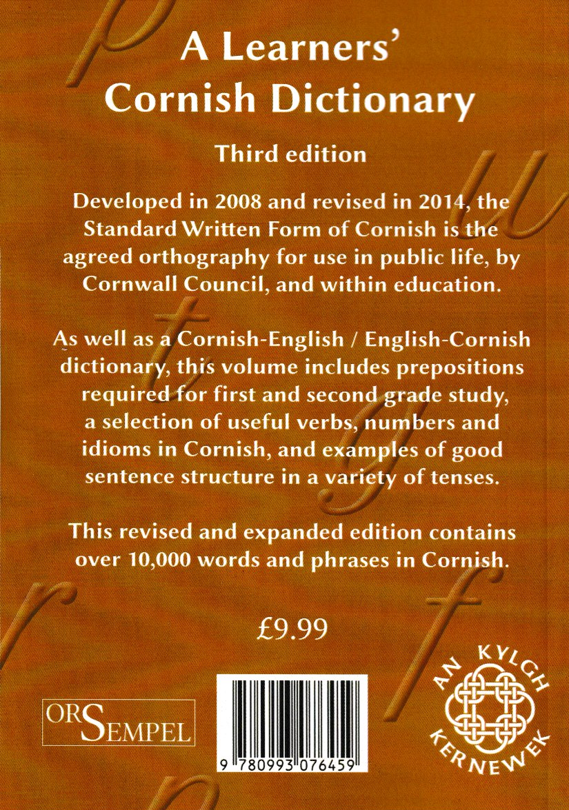 A Learners’ Cornish Dictionary (third edition) is a dictionary in the Standard Written Form containing more than 10,000 words and phrases in Cornish.