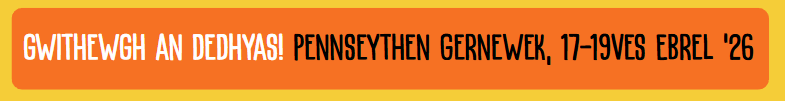 Y fydh Pennseythen Gernewek 2026 dhe 17-19 a vis Ebrel dhe Skol Nessa Truru rag Mowysi, Falmouth Rd, Truru TR1 2HU.