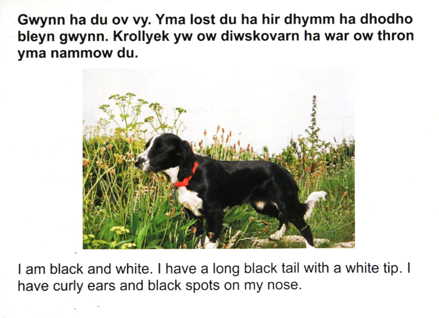Lyver didhan gans hwedhel rag fleghes a vewnans ki Steren, lymnys yn liw dresto gans skrif yn Kernewek ha Sowsnek.